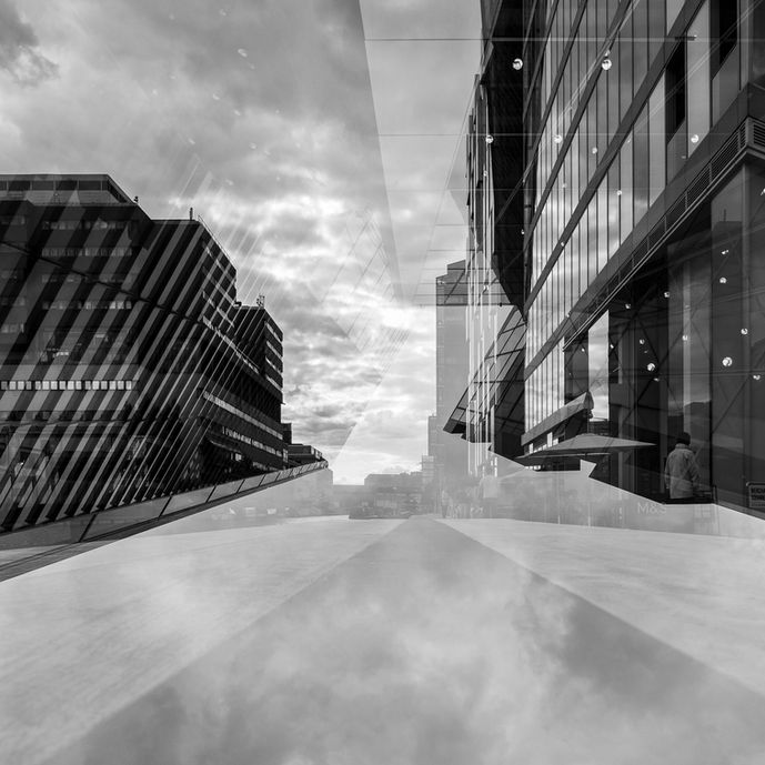 Dans ces « conversations » je propose une lecture subjective du tissu urbain. Structures, surfaces, formes et matières sont réinterprétés au moyen des techniques propres à la photographie. Les jeux des textures, de l’ombre et de la lumière, les reflets, les transparences, les doubles expositions véhiculent mes émotions et estompent la référence au réel. Une ville fantasmée se surimpose ainsi à la ville réelle, reflétant ma perception de l’urbain entre fascination et répulsion. Ce travail photo-graphique rend aussi un hommage – et tend un miroir- aux architectes et aux urbanistes dont le travail transparaît dans le mien, un peu comme dans un palimpseste.